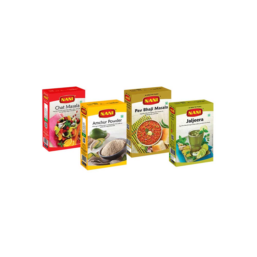 - Chat Masala – 100% Pure Spice Mix – Dry Mango, Common Salt, Black Salt, Cumin, Black Pepper, Dry Ginger And Pomegranate Seeds.