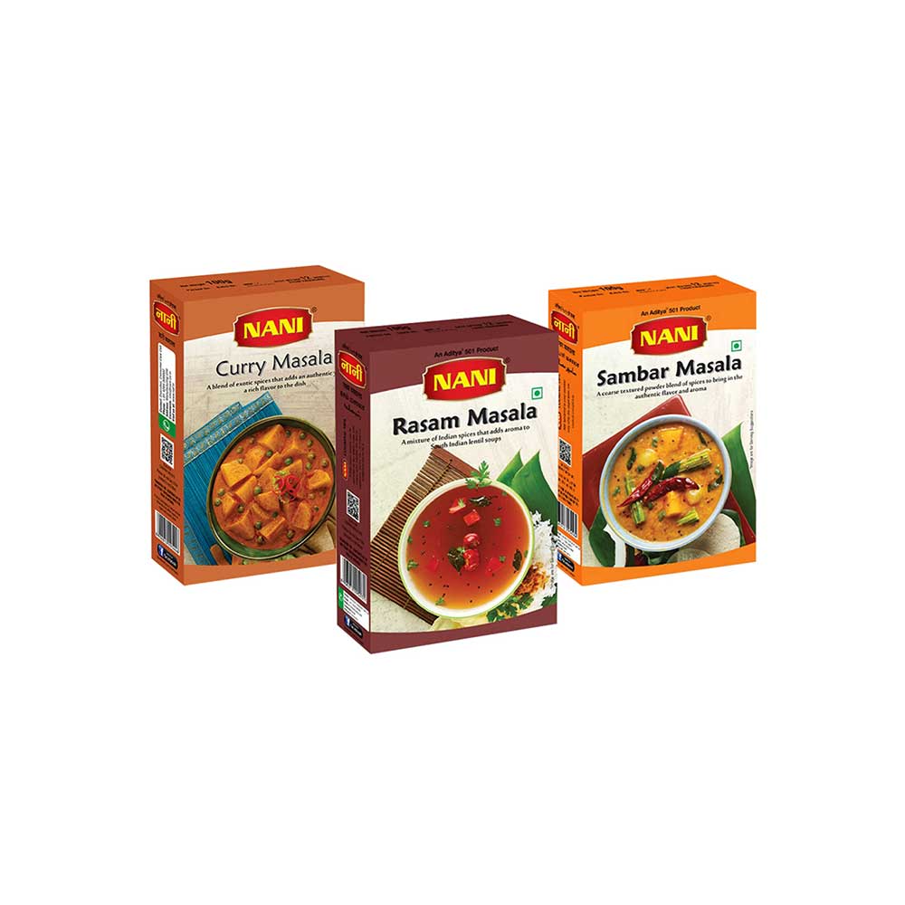 - Sambar Masala – 100% Pure Spice Mix. Ingredients: Coriander, Chilli, Bengal Gram, Cumin, Black Pepper, Fenugreek, Turmeric, Asafoetida And Black Gram.